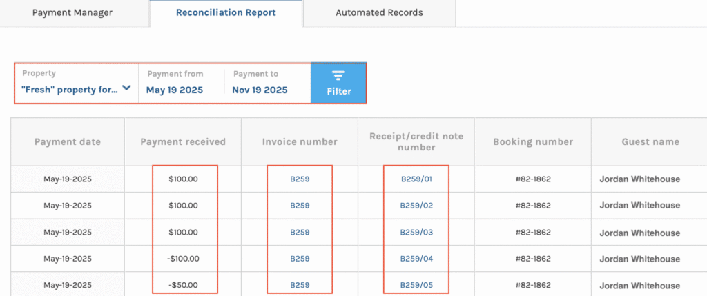 - Filter and view payments across multiple properties by day, week, or custom ranges.