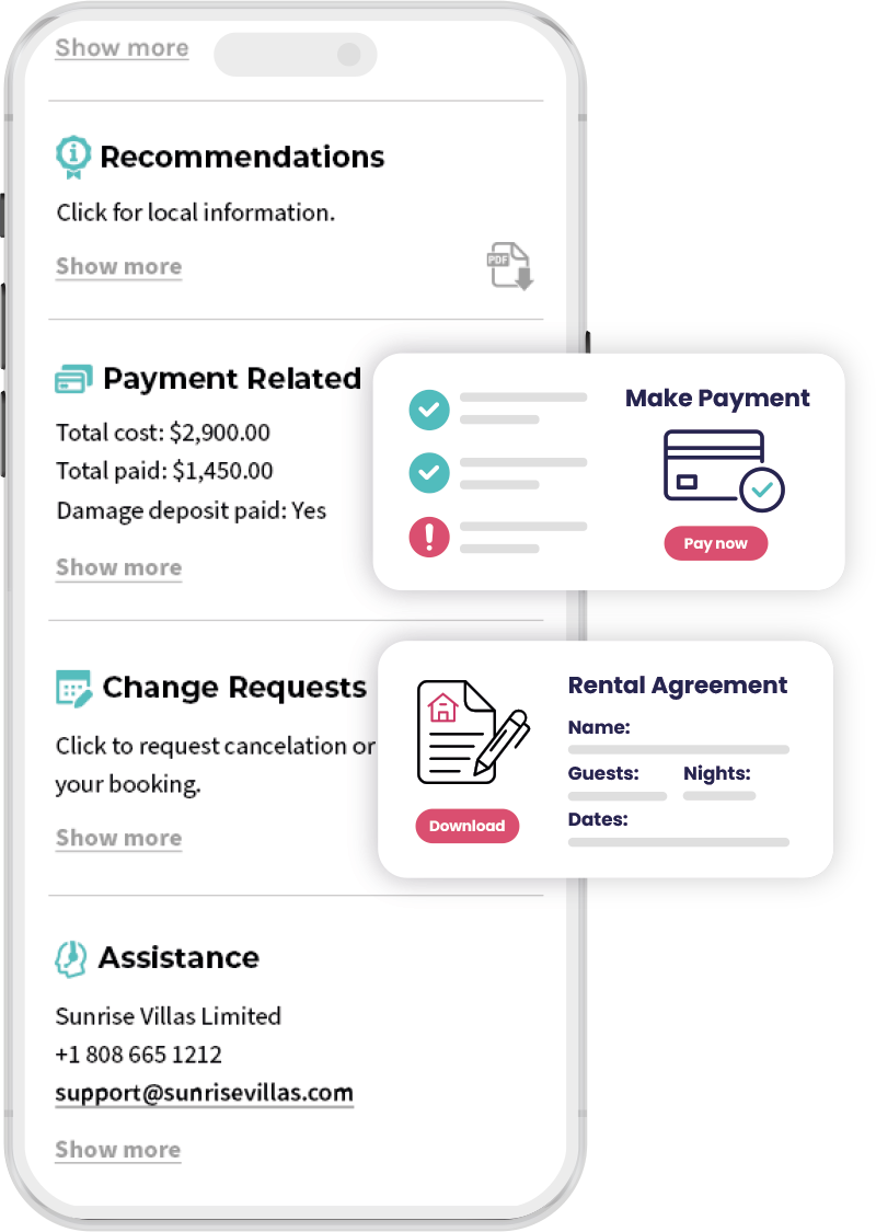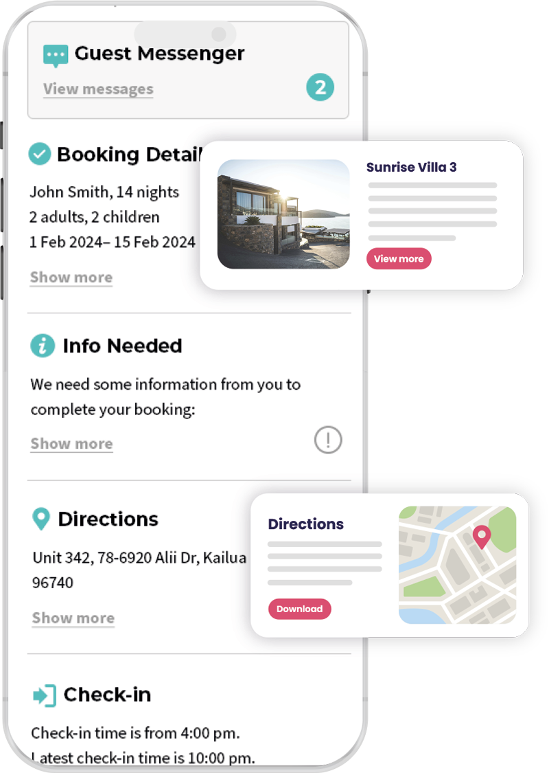 Give guests one place to view booking details, check-in info, property details, and more, right from their phone, whenever they need it.